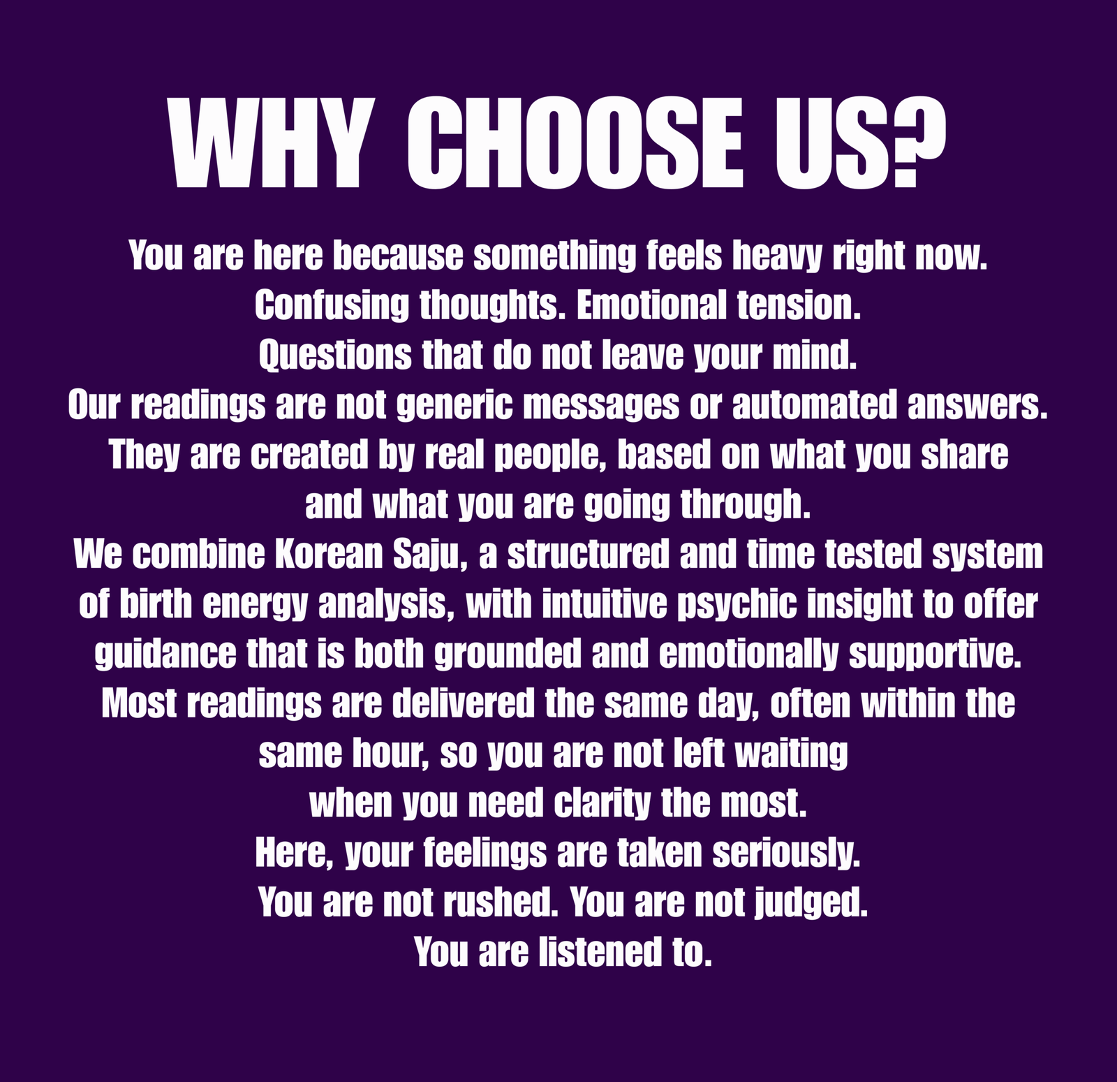 Our work is inspired by Korean birth wisdom and the quiet emotional depth found in Korean folklore. Through calm interpretation and compassionate insight, we hope to help you reconnect with yourself and move forward with clarity and trust.