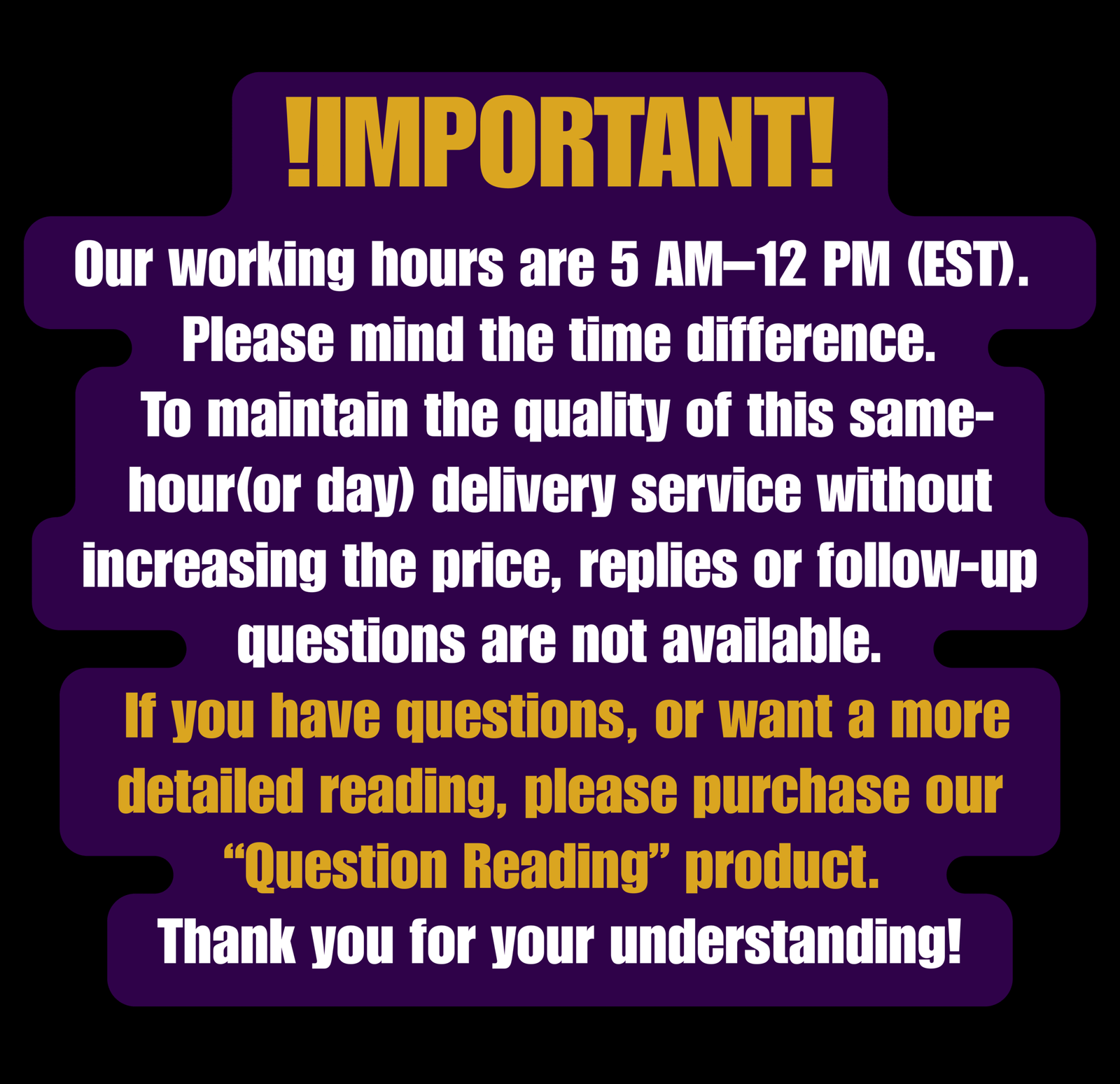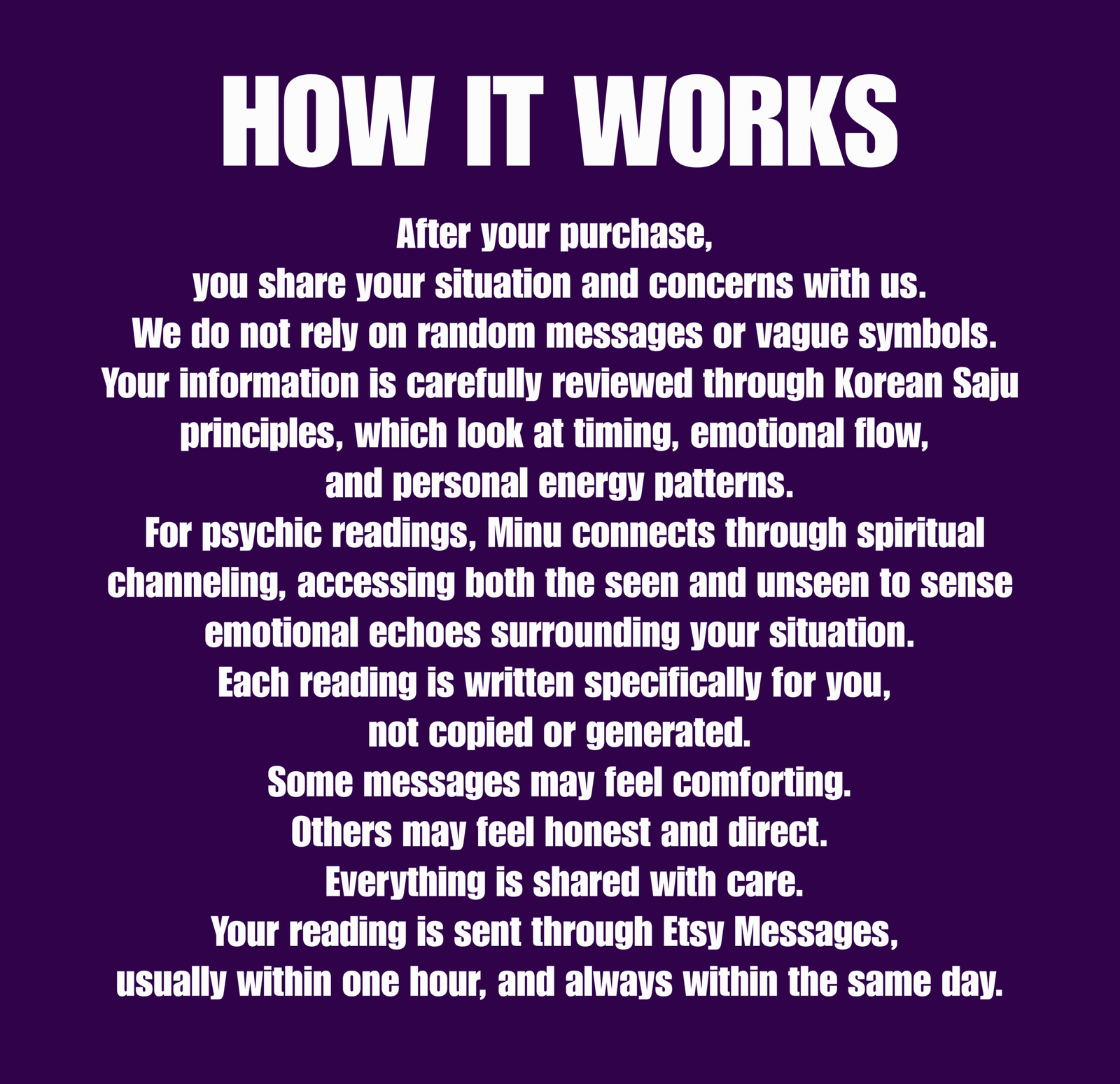 Your reading is personally written with care and sent by email within 1-3 hours for basic(5 elements) option, and within 24 hours for full saju reading option.